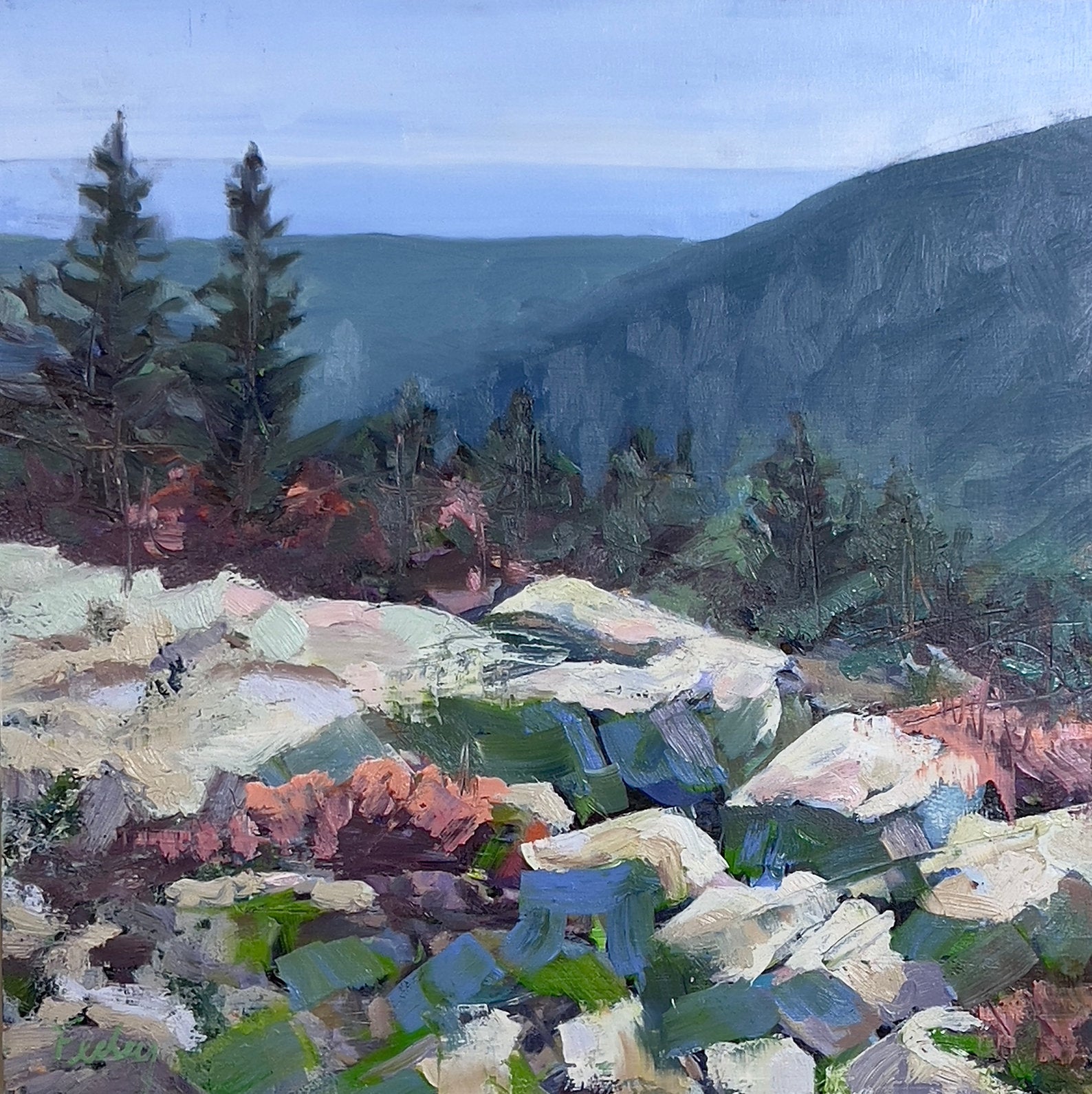 Another view looking south further along Beech mountain trail. The atmosphere changes the colors of the mountains in the distance and softens the details of the trees occupying those mountains. The immediate blocky strength of the rocks before me, welcomes me to sit and feel the warmth they have collected from the sun. All the senses are engaged here, and it is blissful. Add a friend and it multiplies.