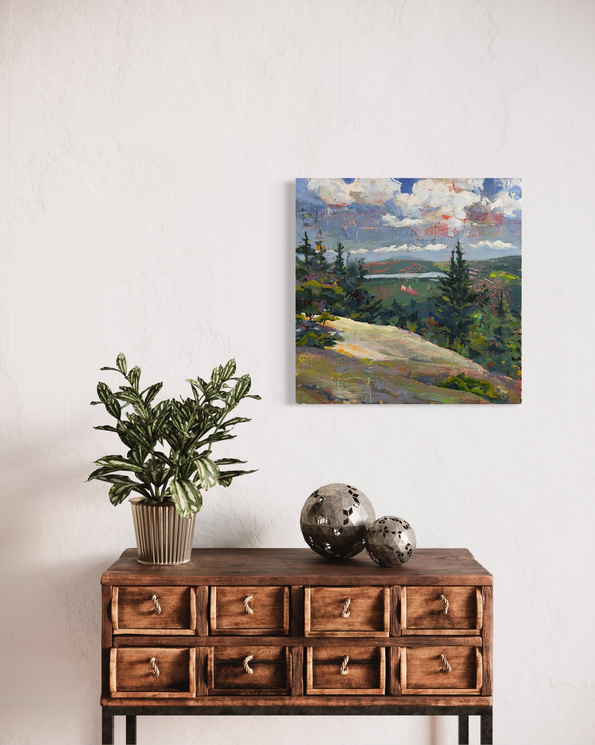 Beech towards Somes, 20" x 20" mixed media (collage, acrylic and oil) on birch