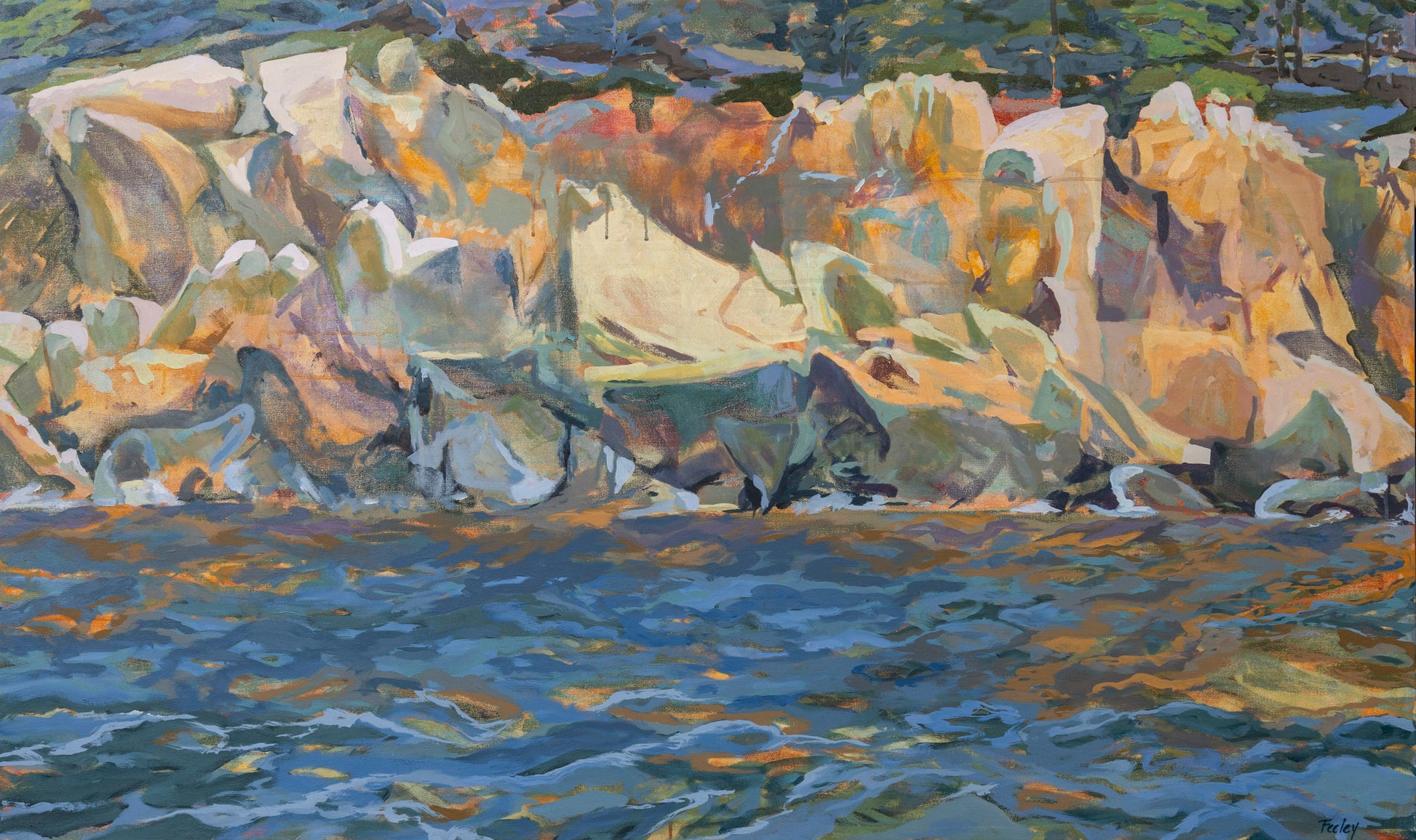 Ocean and Granite-Two totally different elements-one liquid, one solid-one moving about, one sharp & still-one deep teal mixed with sky blue reflections, one pink granite laden with lichen and moss. Each so different from the other, and yet they coexist.