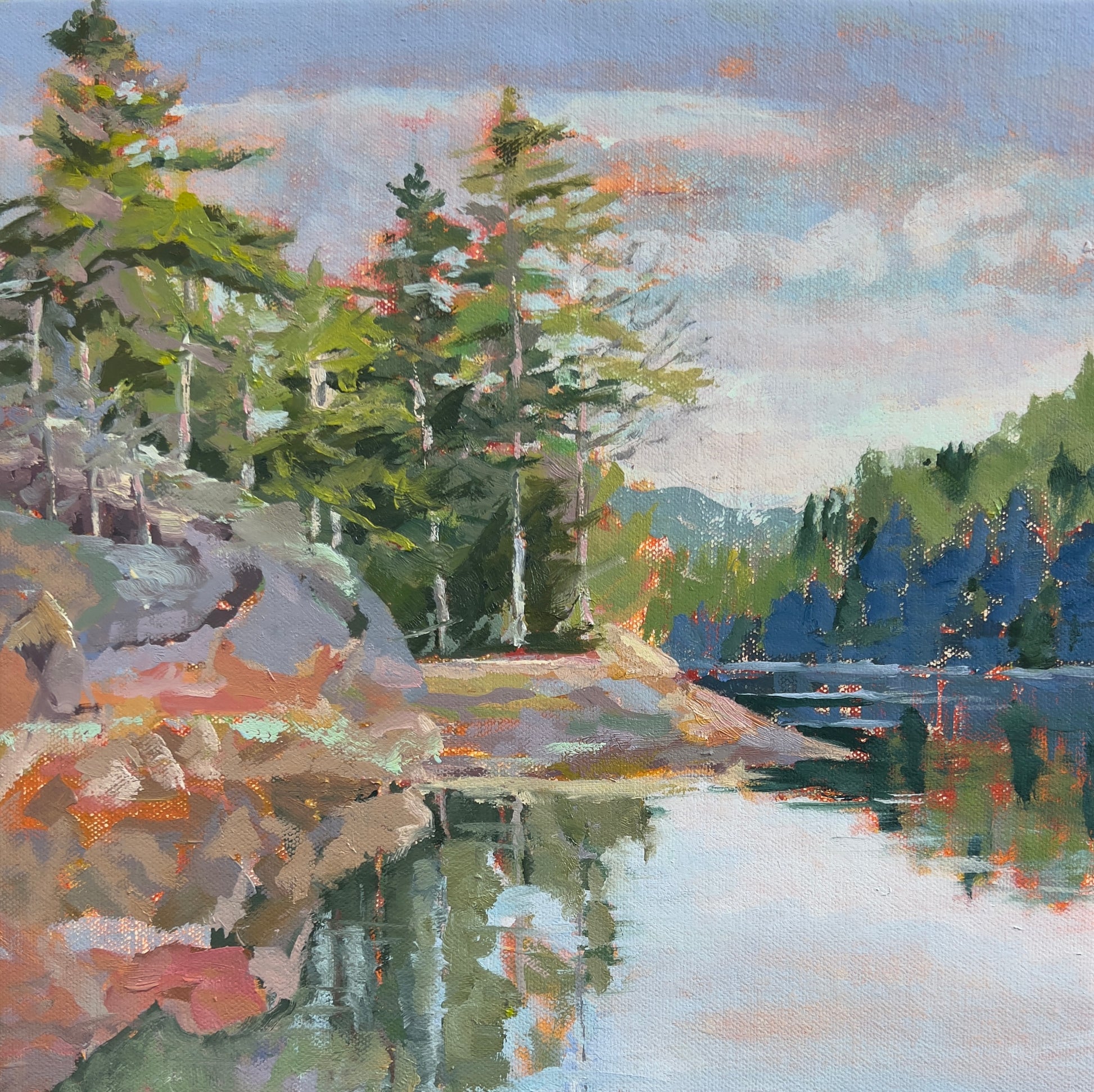 I have painted this view on Somes Harbor three times. The view changes with the time of day. This day was overcast, everything was soft focus, soft colors, soft edges, and calm. Sitting on the dock alone, even for 5 minutes, at any time of the day is a moment of pause. A pause to appreciate the beauty of this moment and a pause to realize how lucky I feel to see this view and to be able to share this peaceful view in a painting.
